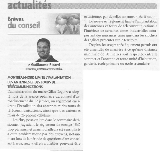 12 janvier 2010- Le conseil d'arrondissement de Montréal-Nord. veut limiter l'implantation des antennes relais sur son territoire.
